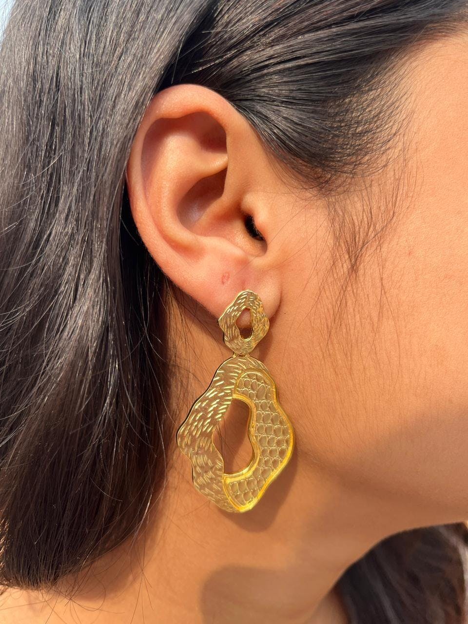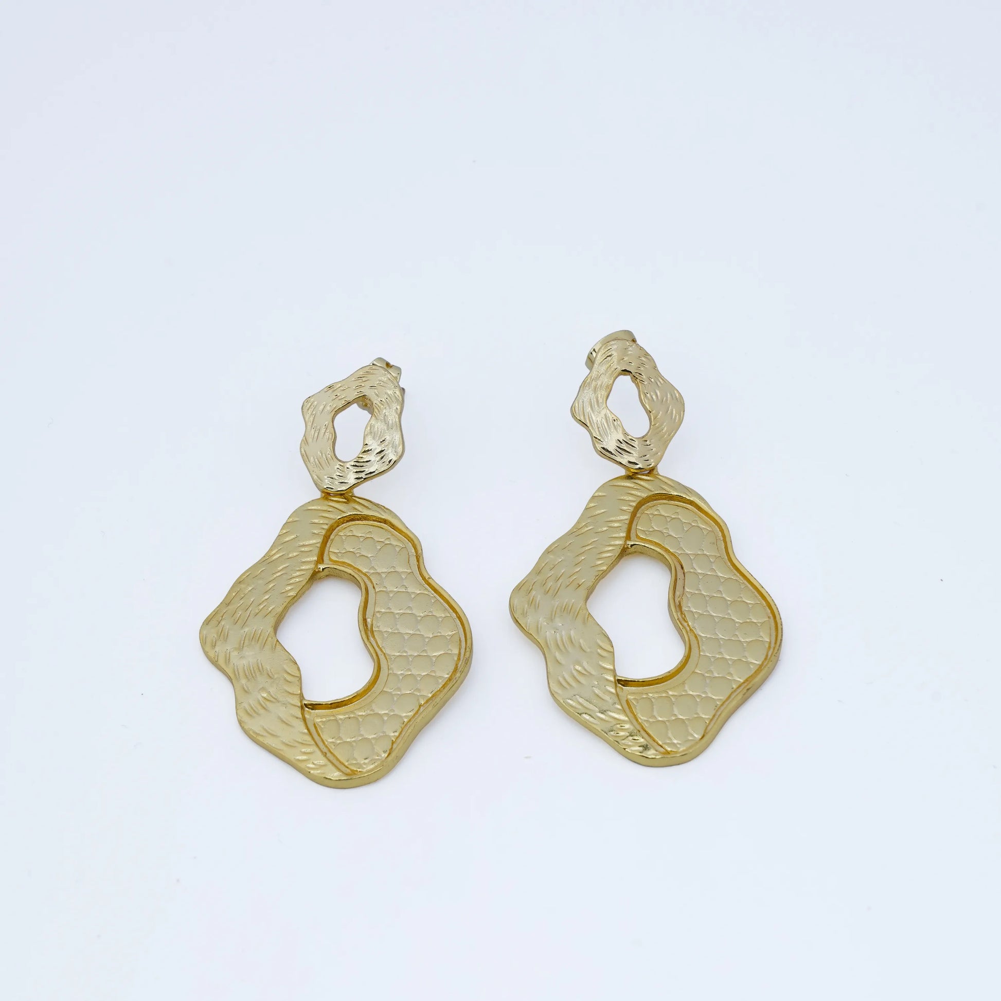 Embrace sculptural elegance with these bold 18K gold-plated drop earrings. Featuring an abstract, organic shape with a deeply hammered texture, these earrings are designed to make an artistic statement while remaining effortlessly sophisticated and modern.