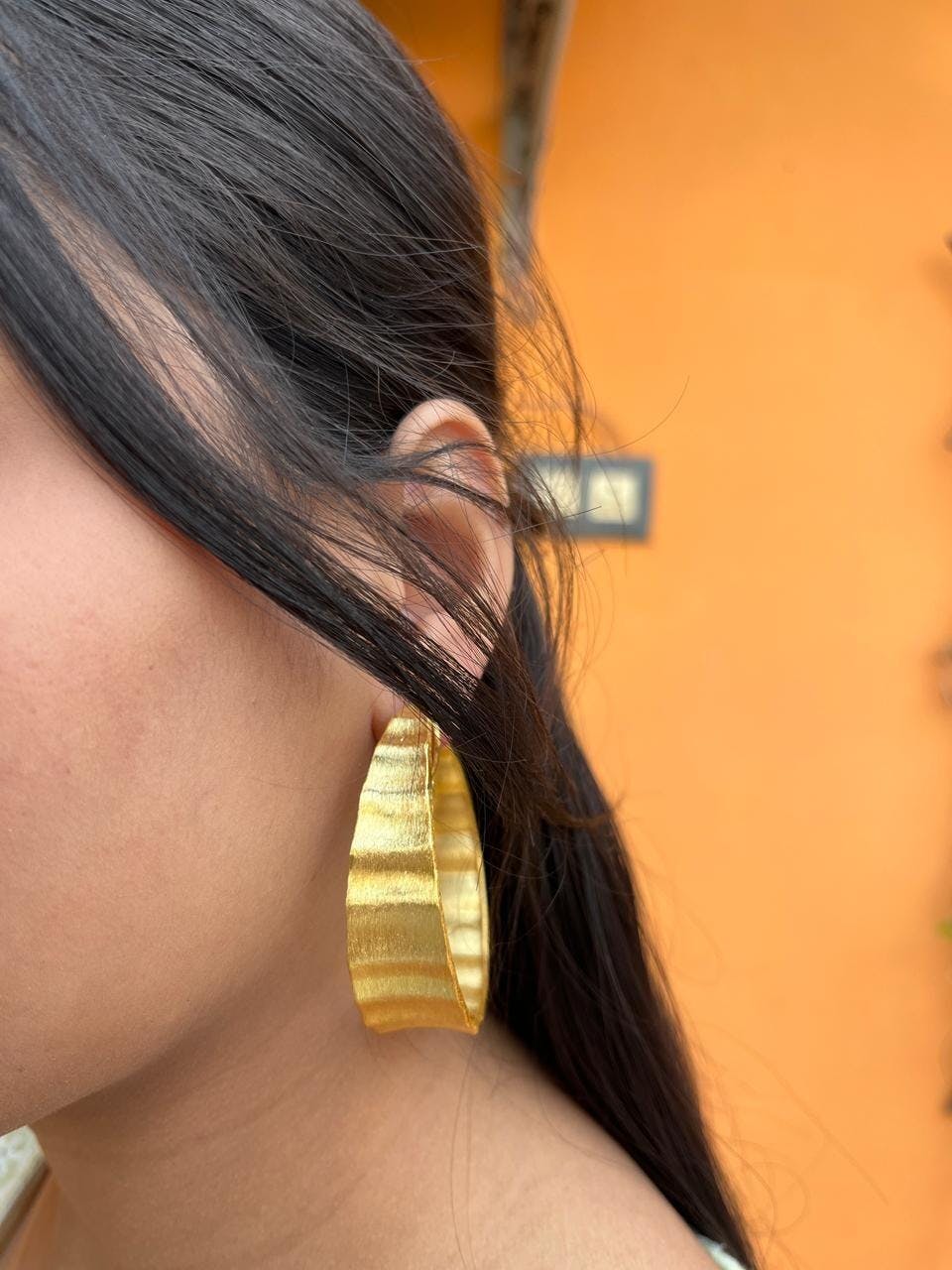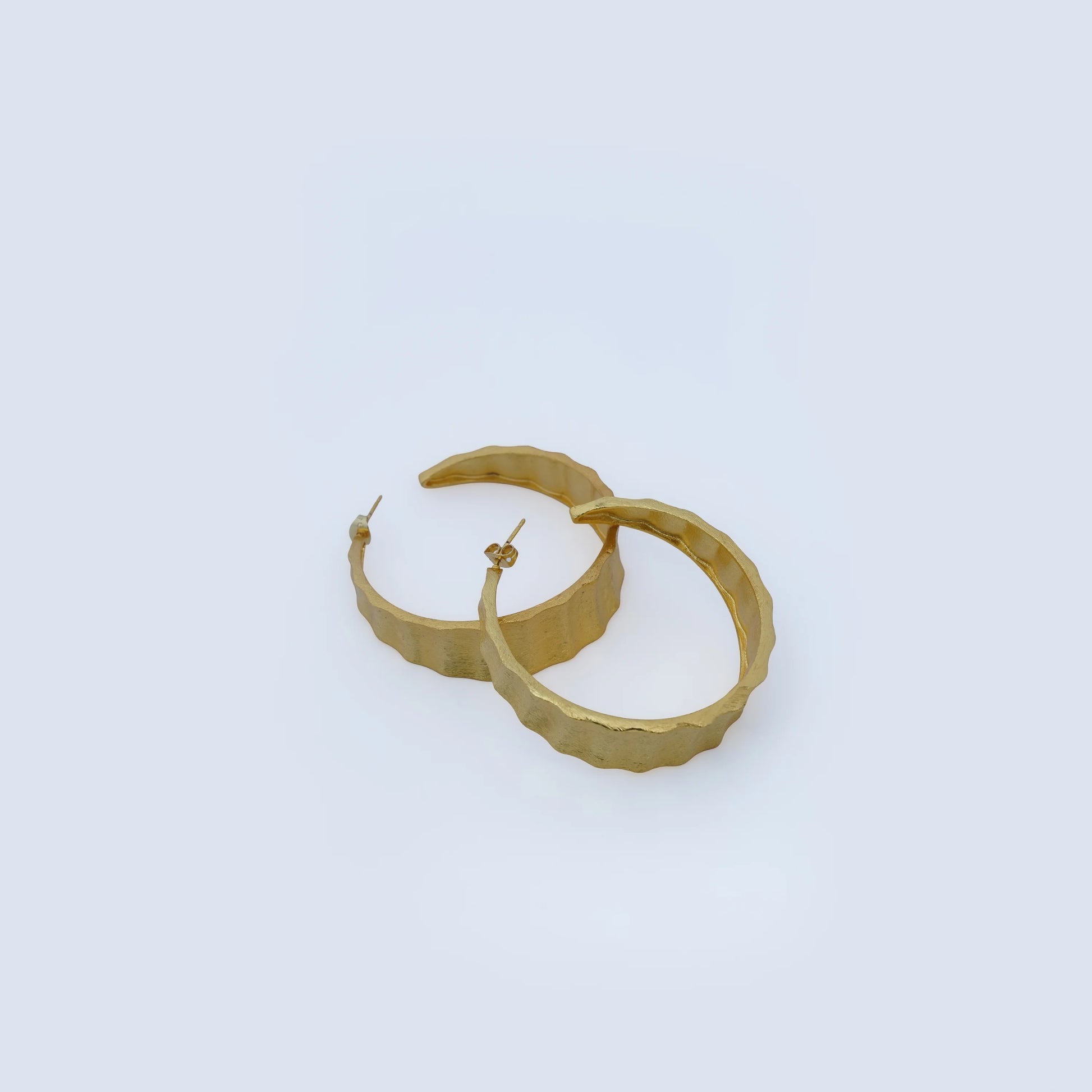 A bold take on the classic hoop, these earrings feature a distinct wavy silhouette and a rich hammered texture. The organic, hand-crafted aesthetic and warm gold finish make them a versatile statement piece that balances modern edge with timeless elegance.