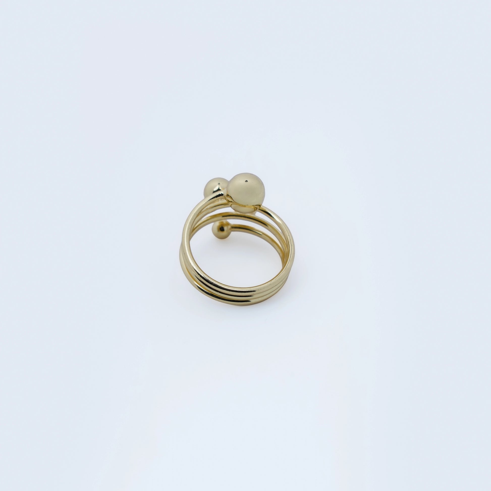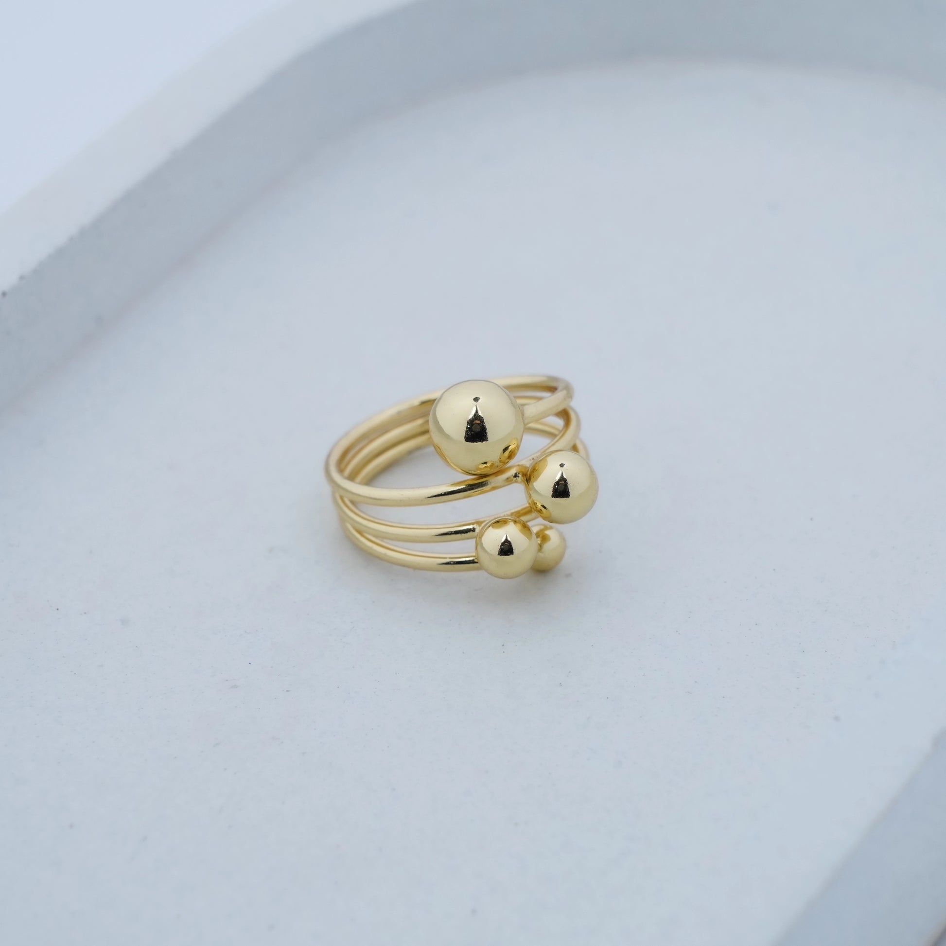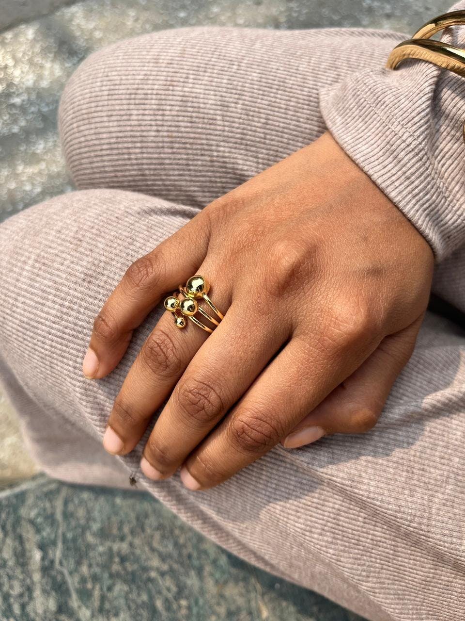 A unique and playful statement ring featuring a multi-strand wrap design accented with four polished spherical gold beads of varying sizes. This 18K gold-plated piece offers a modern "bubble" aesthetic that adds volume and contemporary flair to any jewelry stack.