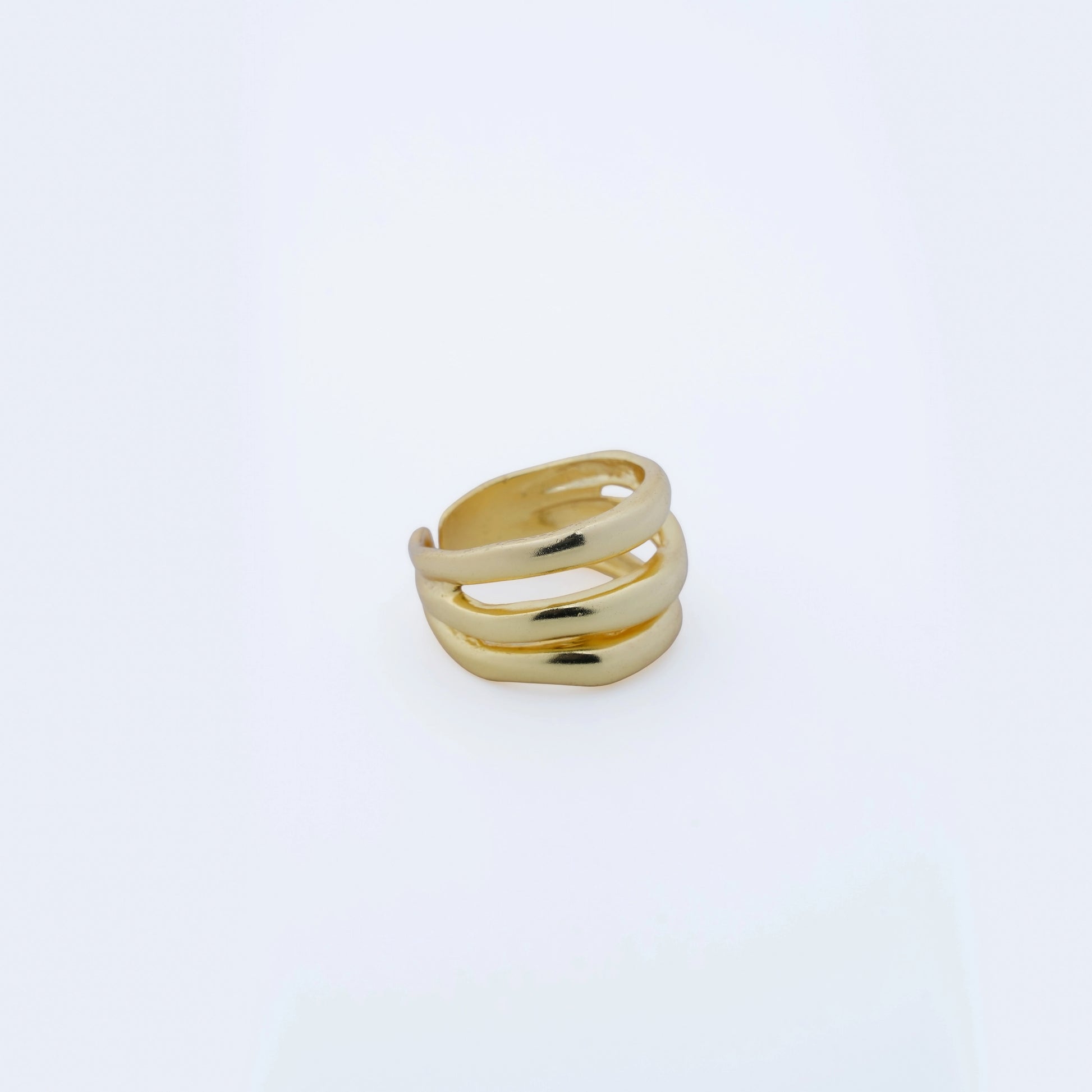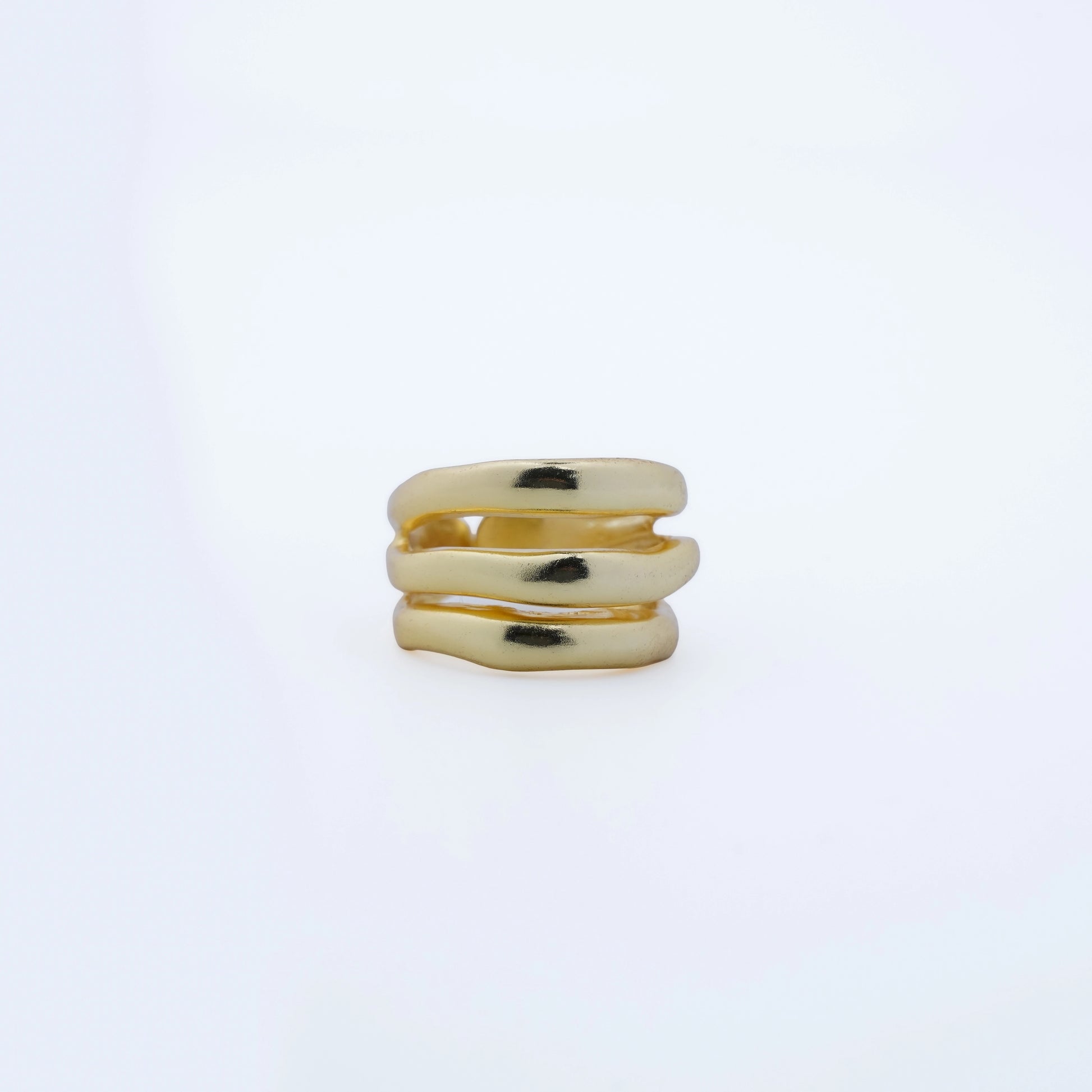 A sleek and modern 18K gold-plated ring featuring a unique triple-band tiered design. This minimalist piece offers a sophisticated stacked look in a single adjustable ring, perfect for adding architectural flair to your everyday jewelry style.
